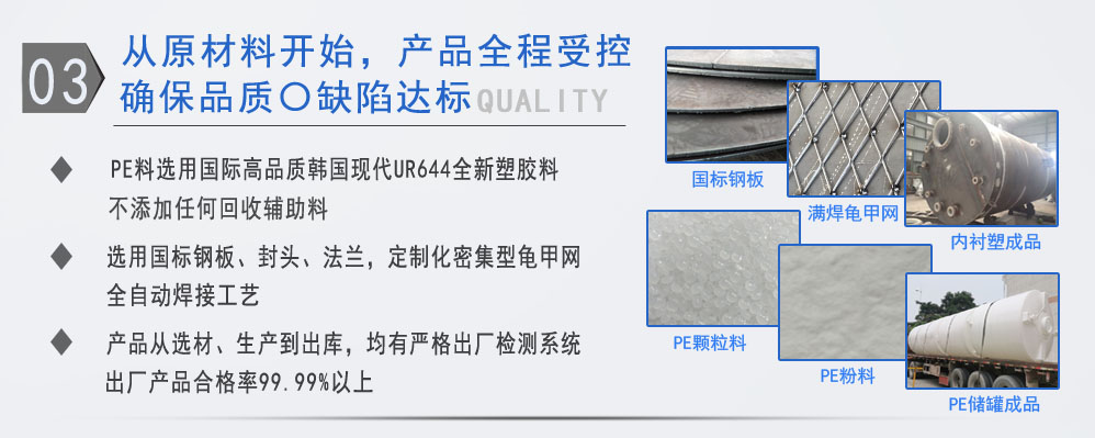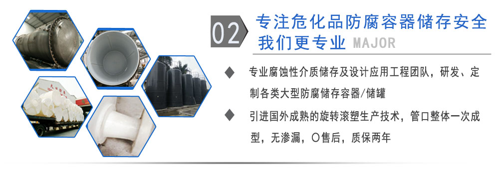 公司有鋼襯塑PE/PO、PE全塑、碳鋼、不銹鋼四大系列100多個品種,專注于常壓儲存容器生產,其產品包括鋼襯塑儲罐管口一體成型PE儲罐、碳鋼儲罐、不銹鋼儲罐、反應釜、攪拌罐、離子交換柱、鋼襯PE/PO儲罐、塑料儲罐、鹽酸儲罐、硫酸儲罐等等。更大限度滿足廣大客戶的各種需求,同時可以根據客戶的需要加工定制各種防腐設備。
